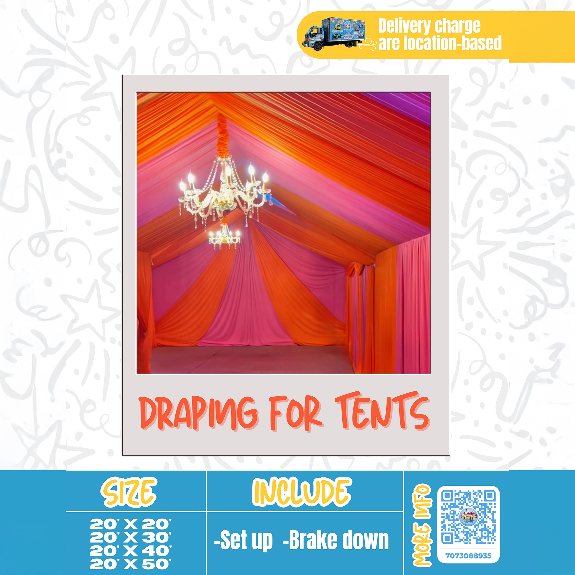 - Draping decorations for tents of the following sizes: 20′ x 20′ – 20′ x 30′ – 20′ x 40′ – 20′ x 50′